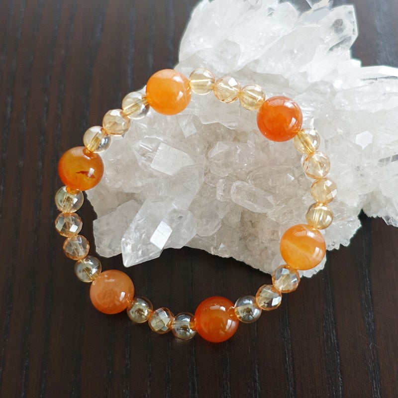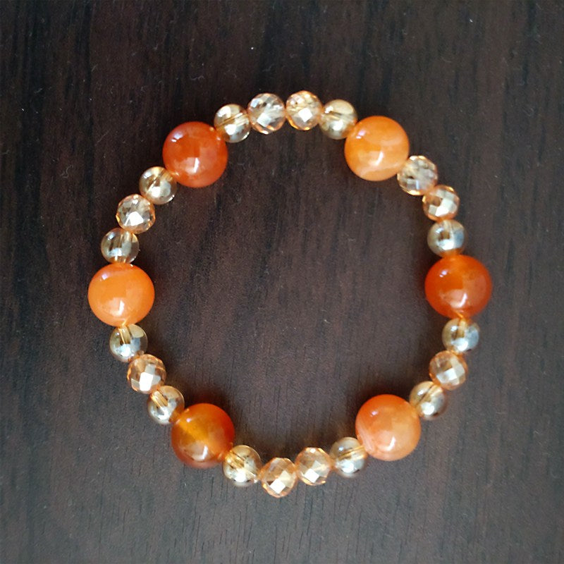 濃淡のオレンジカーネリアンをゴールデンオーラで繋いだブレスレット。オレンジカーネリアンは第2チャクラ(へそ下)に対応する代表的な石で、バイタイリティ、グラウンディング力、人間関係、不屈の精神を養います。ゴールデンオーラは高く明るいバイブレーションを持つ石で、自信と積極性を養い、幸福や金運を呼び込むとされます。