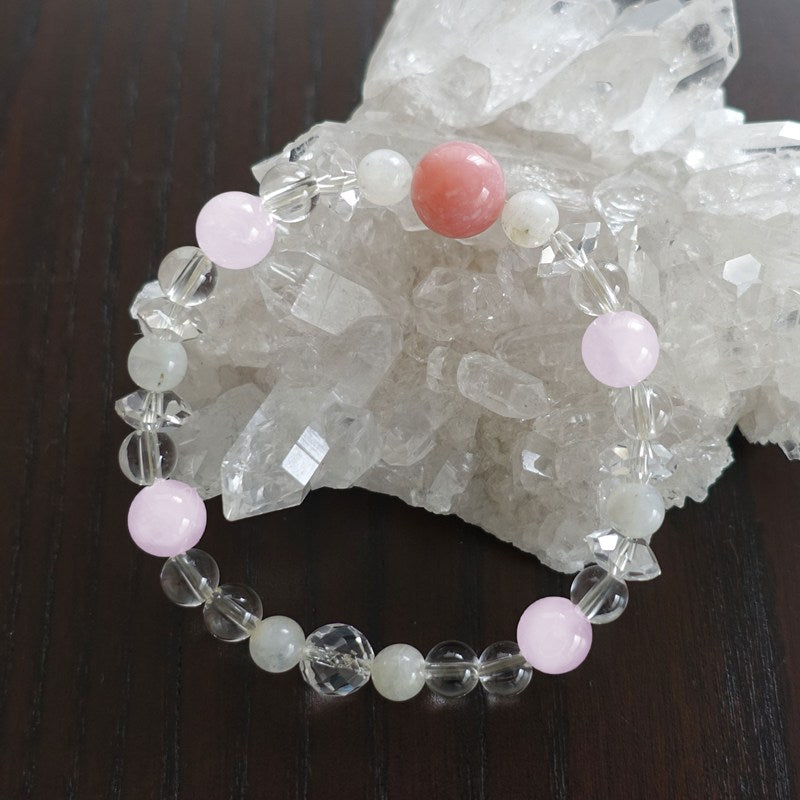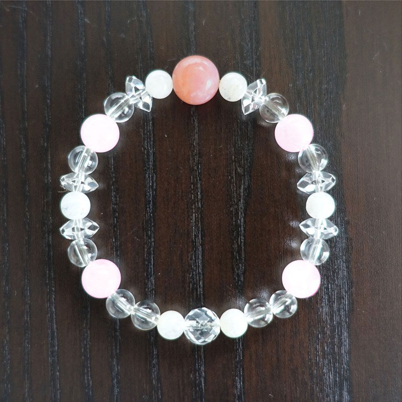 穏やかなやさしい気持ちに導き、幸福感をUPするピンクオパール。やさしさ、愛、平安を象徴するムーンストーン。内面の美しさを引き出し、愛情を豊かにするローズクォーツ。この3種の石をクリアな水晶で繋ぎました。6mm玉、多面カット7mm玉、ボタンカット4mmの水晶3タイプを使用し、変化をつけることでキラキラ感とお洒落度をUPしました。ピンクオパール10mm玉の両脇には青い光が映るブルームーンストーンを配しました。ローズクォーツは