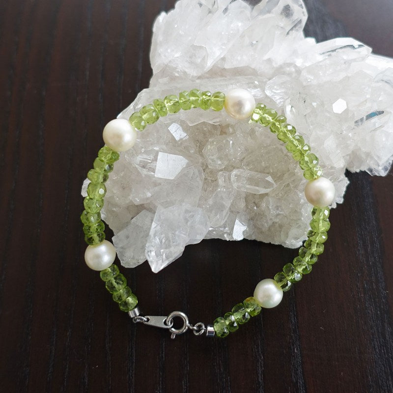 この淡水パールとペリドットのコラボブレスは、持ち主を明るいフレッシュな気持ちに導き、恋愛、結婚、ビジネス、友情、趣味など、様々なシーンでの新たな出会いをサポートしてくれるでしょう。