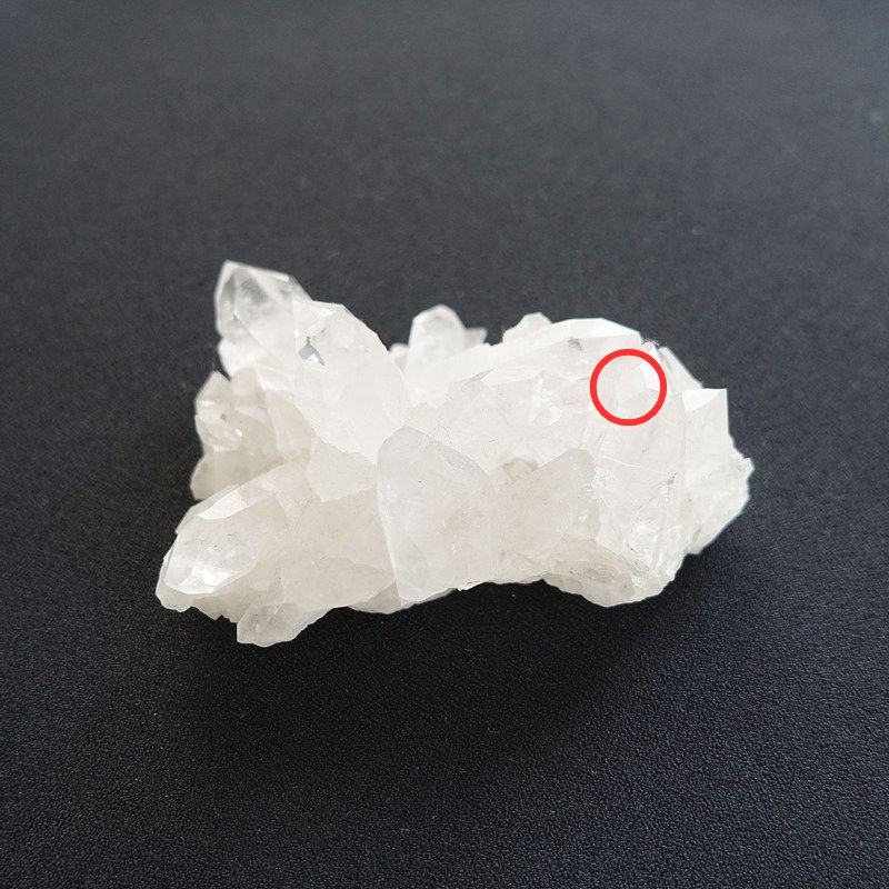 こちらの水晶クラスターにはたくさんの結晶が群生しておりますが、よく見ると「ソウルメイトツイン」の結晶が見られます。1枚目の画像の右下方に「重なり合っている2つの結晶」がそれです。