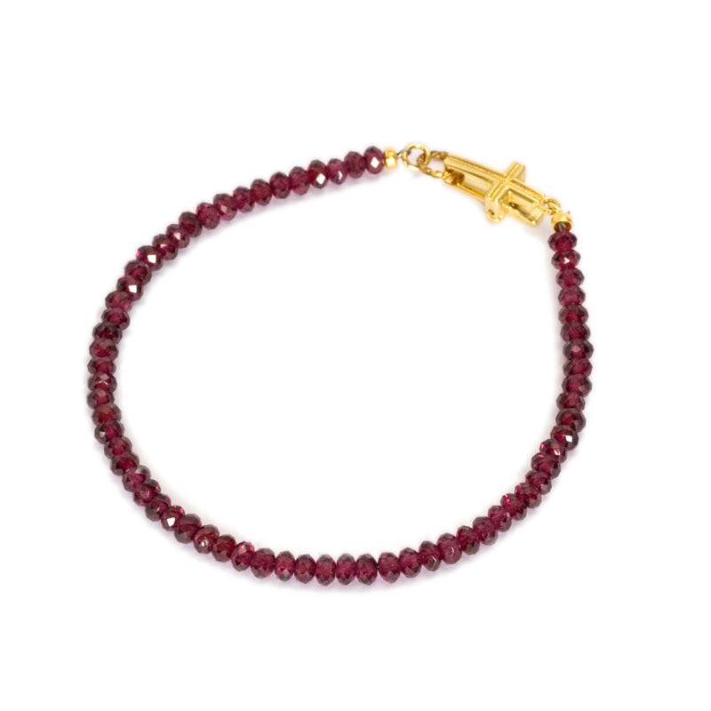 ワインレッド色のガーネットAAのブレスレットです。光に反射するとカットビーズがキラキラ光ってとても美しいです。クロス型の留め具はクリップ式なので、装着がとても楽です。画像よりも実物の方が赤みが強いです。
