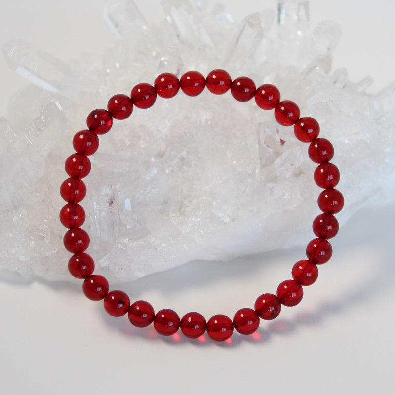 真紅のルビー色がとても美しいバルティックアンバーのブレスレットです。穏やかで温かいパワーを感じることができます。アンバー(琥珀/コハク)は植物の樹液が地中に埋もれて化石化した天然樹脂。樹木が光合成を行う時に二酸化炭素を吸って酸素を吐くように、アンバーはマイナスエネルギーを抜き取り、心身にプラスのエネルギーを循環させるので、心身のデトックスとリフレッシュに最適です。マイナスエネルギーの滞りによって起こる心身のアンバランスや不調を軽減して、免疫力や抵抗力を上げ肉体を強化するといわれています。精神面では明るくポジティブなエネルギーを与えてくれます。また、緊張を緩和してリラックスを促し落ち着きを与えてくれます。呼吸を楽にする働きや周囲のマイナスイオンを引き付ける効果も注目されています。健康、長寿にご利益があるとされることから「生命の宝石」とも呼ばれています。樹脂なので着けているのを忘れるくらい軽いです。