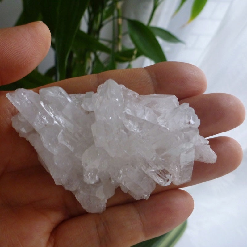 ブラジル産の水晶クラスターです。良くみると小さな「レインボー」が入っています。タイムリンク(パスト&フューチャー)も確認できます。高さは低めで平らな形状のクラスターです。レインボーはポジティブなエネルギーを増し、心身の疲労を癒し、感情に喜びをもたらすパワーがあるといわれています。小サイズなので、手の平に乗せることもできますし、ブレスレットの中心にクラスターを置けば、ブレスレットの浄化にも働きます。また、ピアスやリングなどの小さなアクセサリーを乗せて浄化することもできます。