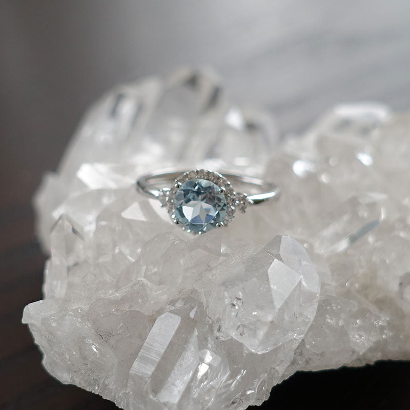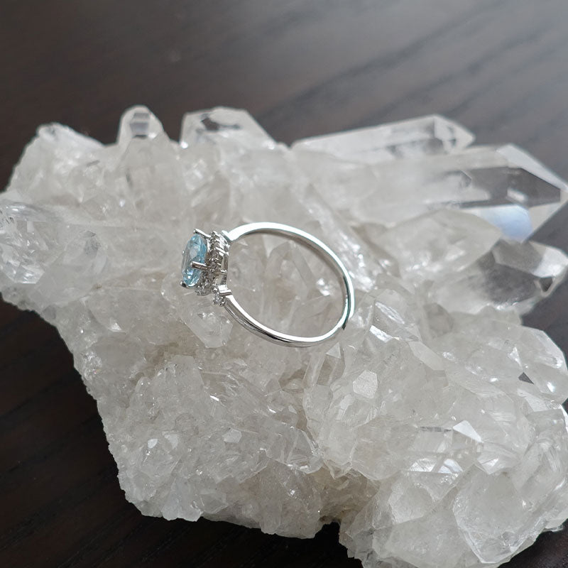 美しい水色のブルートパーズをジルコニアのフレームで飾ったリング。リングの金属部分でサイズ調整ができるようになっています。