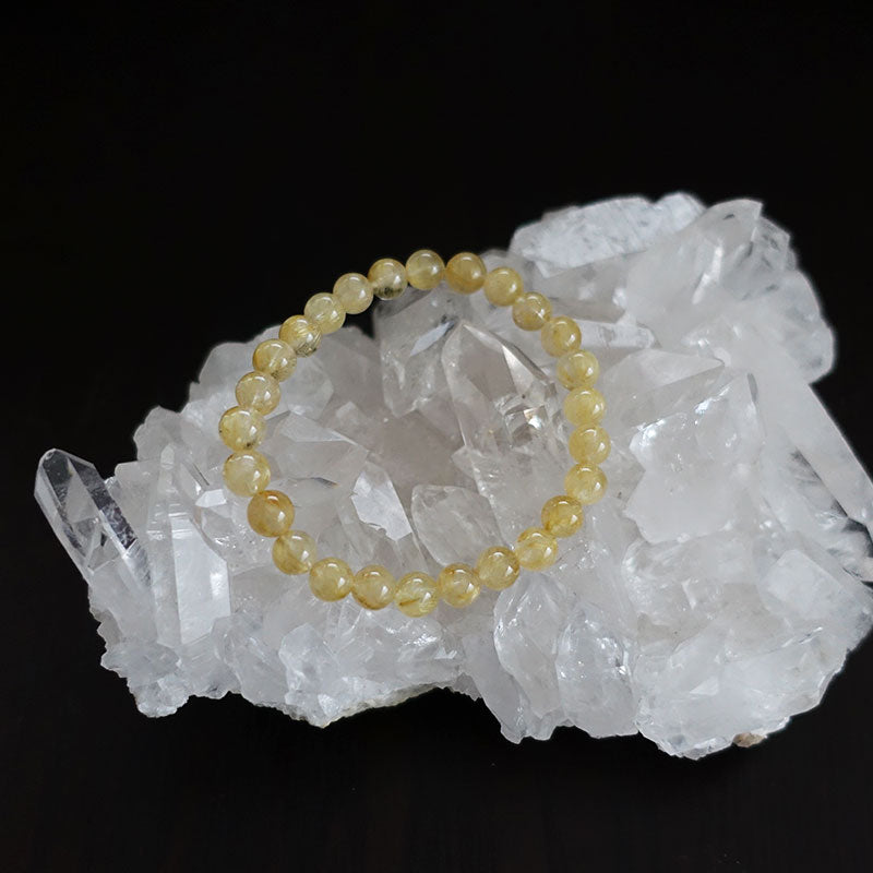 針状の内包物が入っている水晶で、一般的に金色の内包物が混入されてるものをルチルクォーツと呼ぶ。針がアンテナの働きをして、天の恵みや宇宙からの情報を受信しやすくするとされる。また、脳を活性化して、直観力や集中力、インスピレーションを高める。精神力や気力を向上させ自信を与えてくれる。積極的、行動的になり、リーダーシップがとれるように促す。意志を強固にし、仕事や受験、金運や勝負運などあらゆる目標の成功へと導くとされる。気管支や喉の弱い方にもおすすめ。
